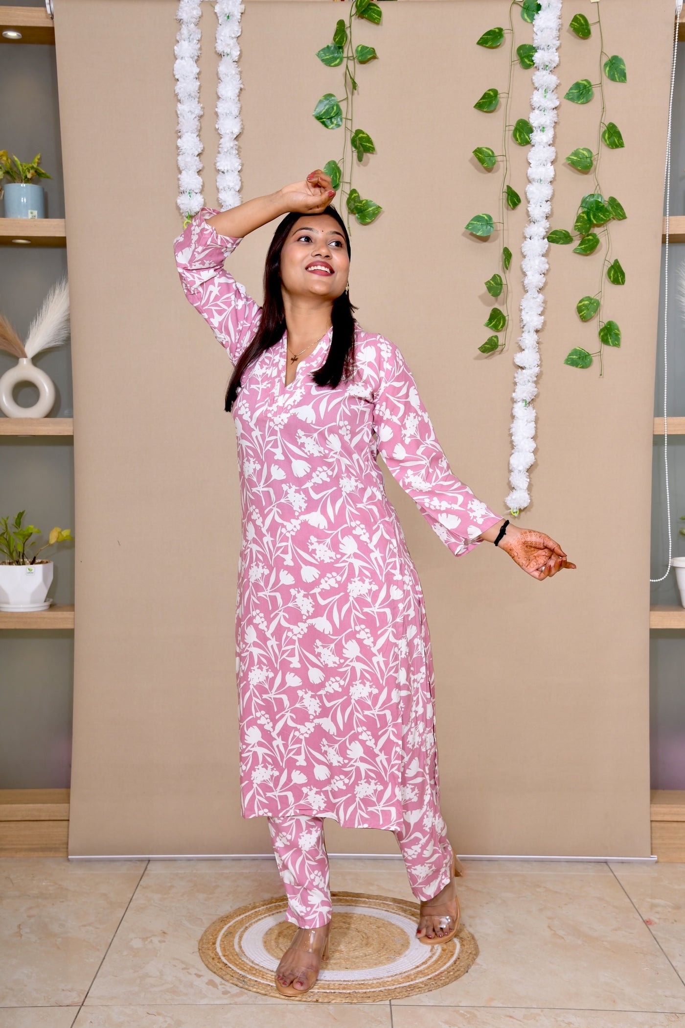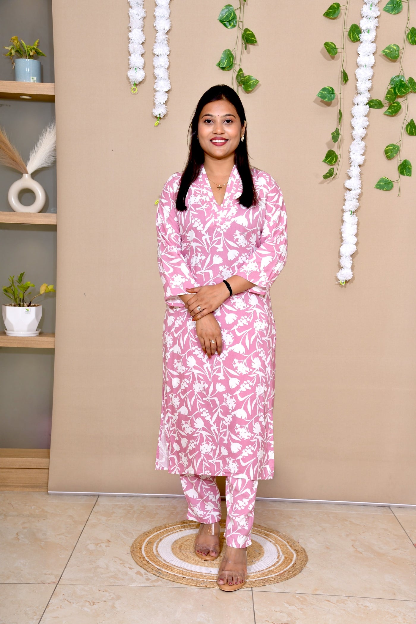Bring a refreshing charm to your wardrobe with this pastel pink floral everyday long co-ord set. Designed in a soothing color palette, the kurta features a chic V-neck with pleated detailing and a breezy straight cut for all-day comfort, paired with matching printed straight pants. The soft fabric drapes beautifully, making it a perfect pick for both work wear and casual outings. Details Fabric Pure Cotton (lightweight, breathable & flowy) Color Blush Pink base with White Floral Print Kurta Style Straight cut, side slits, pleated V-neckline, 3/4th sleeves Bottom Printed straight pants (co-ord style) Occasion Everyday wear | Workwear | Casual outings - Vastrinee