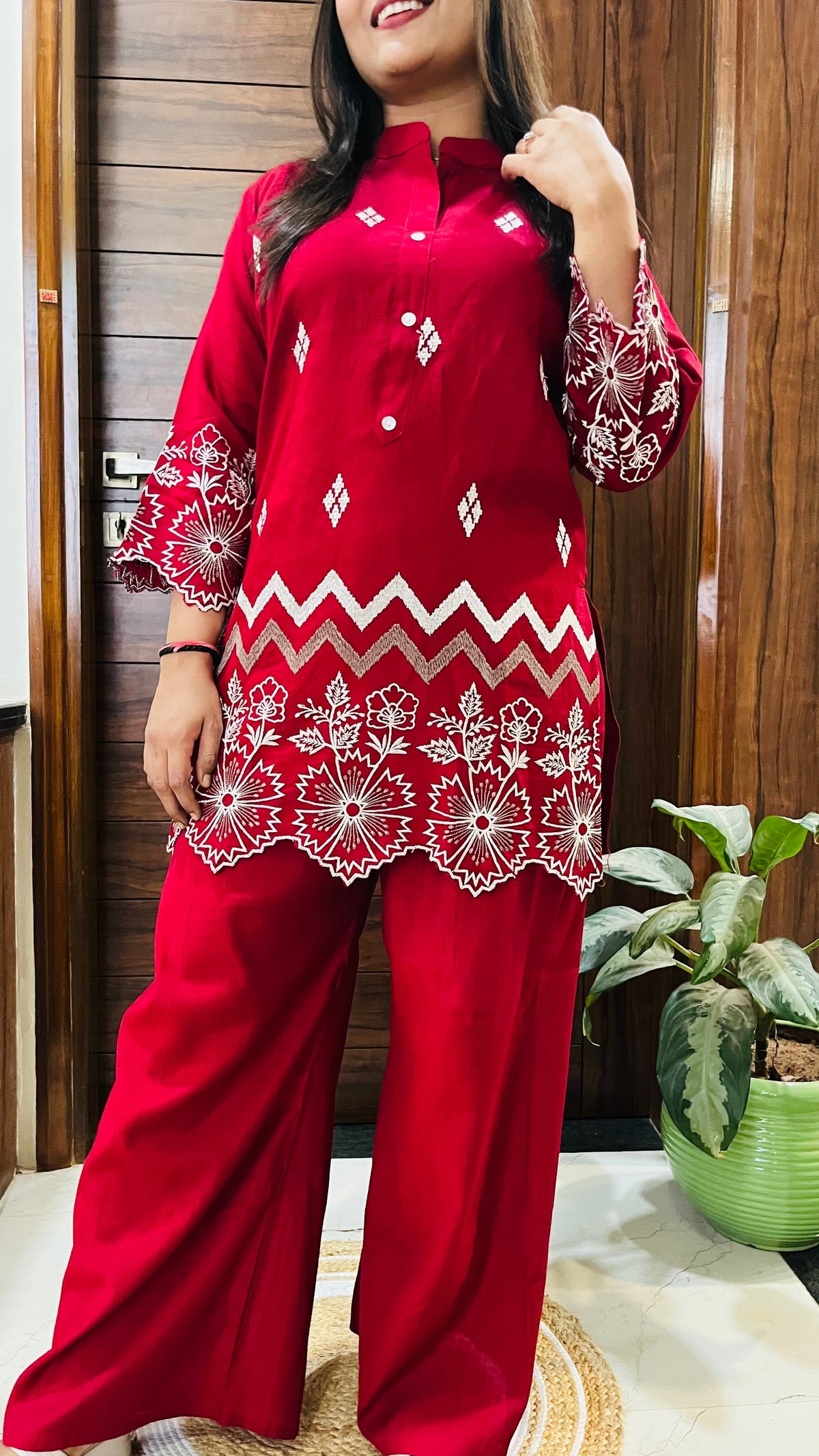 Turn heads effortlessly with this stunning maroon co-ord set, designed to exude confidence and class. Crafted from a soft, flowy fabric, this ensemble features intricate white thread embroidery along the hem and cut-work over sleeves, giving it a graceful handcrafted charm. The minimal geometric motifs across the kurta add a modern twist, while the relaxed-fit pants ensure complete comfort and style. Perfect for festive brunches, office gatherings, or casual evening outings.