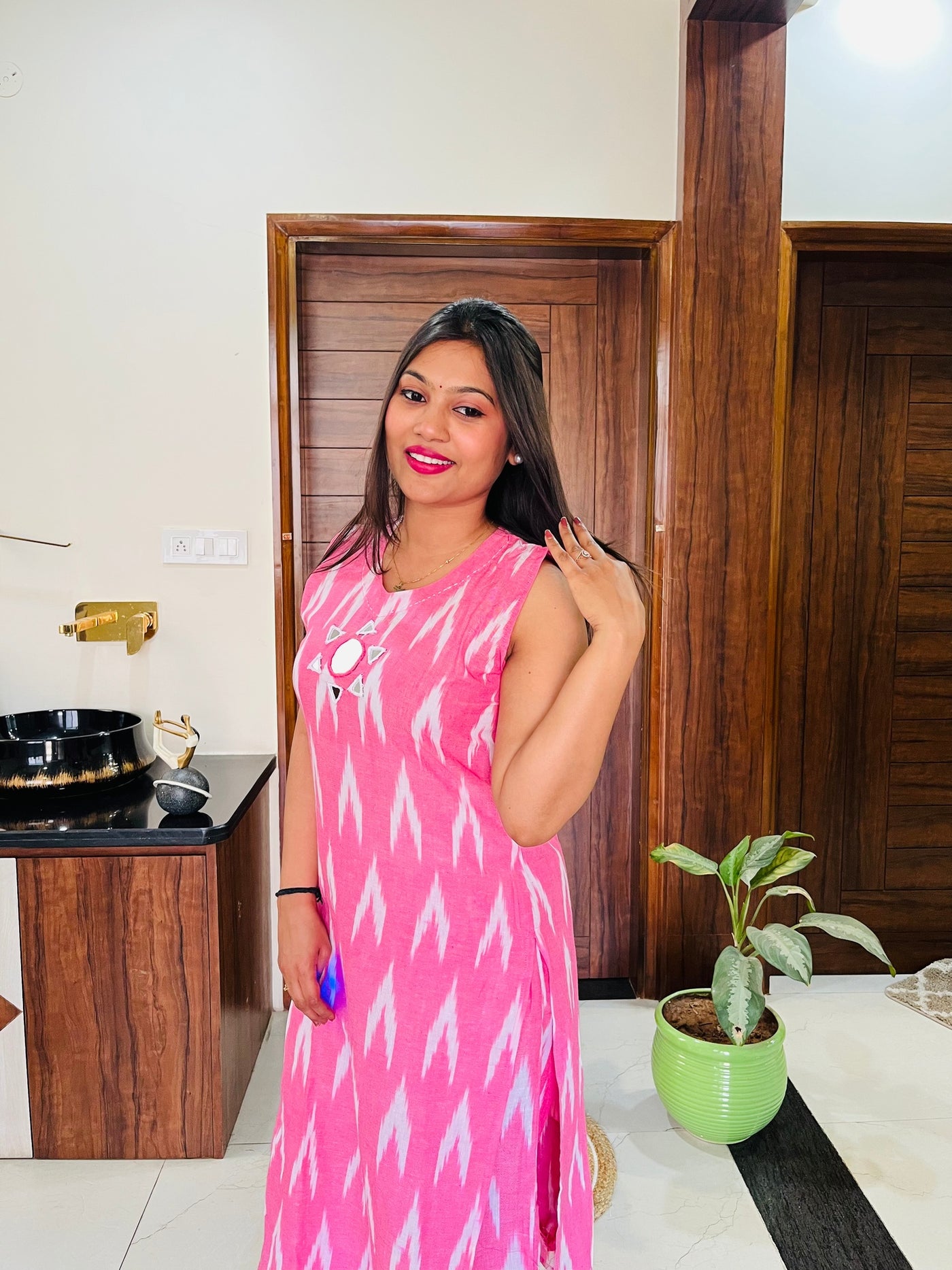 A lively pink kurta set designed for easy everyday elegance. Featuring a classic ikkat-inspired print with a modern sleeveless silhouette, this set keeps you cool, comfortable, and effortlessly stylish for warm days and relaxed outings. The kurta includes extra matching sleeve fabric attached for optional sleeve stitching and has a handy one-side pocket, paired with plazzo pants for all-day ease.